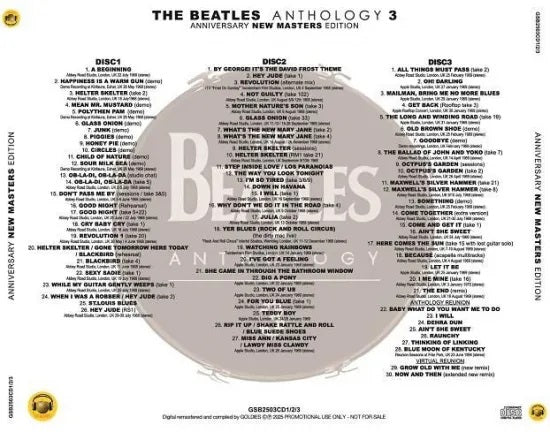 今回の『アンソロジー3』30周年アニバーサリー・エディションは1996年リリースのオリジナル未収録のアウトテイクやデモ、TVショウやライブに至るまで未発表音源を多数追加した全83トラックの新編集増補改訂版でオリジナルに比べ音質向上はもちろんこれまで以上のノーカット編集やAI編集によるモノラルからリアル・ステレオに変換されたデミックスも採用し新発掘や初登場音源も含む全曲ニュー・マスターによる新たな音源ソースを元に全面的にアップデイト・リニューアルされた内容となっている。『アンソロジー3』では1968年ホワイト・アルバム・セッションから始まり69年1月のゲット・バック・セッションさらに最後のレコーディング・アルバム『アビイ・ロード』そして95年ポール、ジョージ、リンゴ3人による再結成が実現したセッションおよびバーチャル再結成として今だに未発表の「グロウ・オールド・ウィズ・ミー」と当初収録が見送られ2023年遂に陽の目を見た「ナウ・アンド・ゼン」までを収録。ディスク1はオリジナル同様ホワイト・アルバム関連音源から大幅に内容拡大して収録。アコースティックによる”イーシャー・デモ”は2018年デラックス・エディションで全曲収録されたがここではマルチトラックからの新たなリミックス音源で収録されている。またオリジナル未収録のセッション音源はじめデヴィッド・フロストTVスタジオ・ライブ音源やロックンロール・サーカスからも収録。さらに”ゲット・バック・セッション”や『アビイ・ロード』関連音源もこれまでとは異なる最新ステレオ・デミックスで収録されている他、「グッドバイ」や「ヒア・カムズ・ザ・サン」等オリジナル未収録のトラックも新たに追加収録されている。そしてアンソロジー・プロジェクトとして後に映像公開されたポール、ジョージ、リンゴ3人による再結成セッションさらに今も未発表の「グロウ・オールド・ウィズ・ミー」と最後の新曲とされる「ナウ・アンド・ゼン」は最終バージョンとは異なるジョンのサビが含まれた未発表のコンプリート・バージョンで収録。いずれもジョンのボーカルが一段とリアルにクリーンアップされ演奏自体もクオリティ・アップした最新リミックスで収録。新たな感動を呼び起こすベスト・リミックスとして注目のニュー・バージョンとなっている。